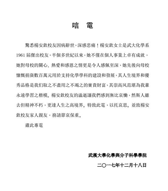 20171216日,91社区 杰出校友杨安钦女士因病辞世,永远地离开了我们,众多学生教师深感悲痛。