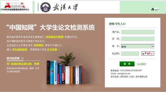 1、登陆“中国知网”大学生论文检测系统//whu.check.cnki.net/,(请保存此链接,一定要点击这个链接),点击教师入口。显示如下页面,输入用户名和密码,身份选择教师,验证码不分大小写。