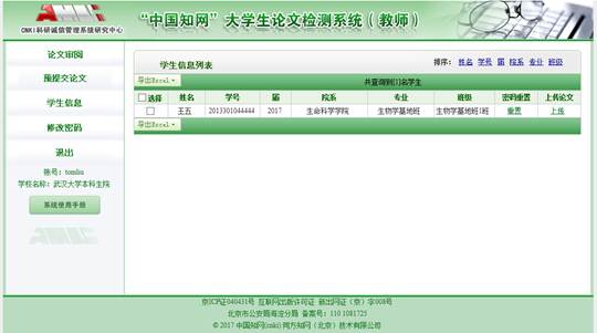 3、点击左侧“学生信息”栏,进入到如下页面,可以看到本人指导的学生名单,在此界面也可以为学生重置密码和上传论文。(学生自己上传和教师上传总次数只有2次)
