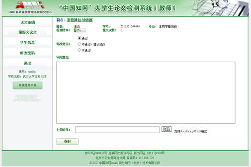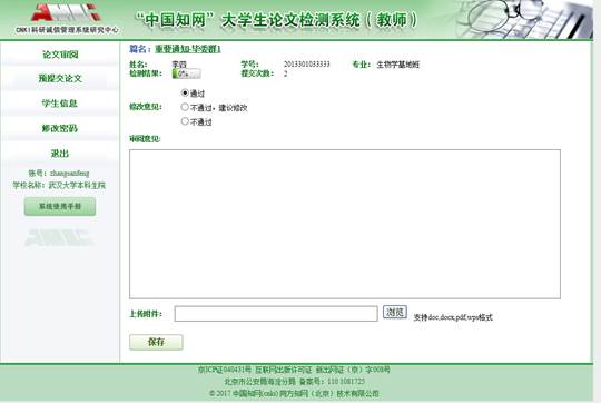5、在上图页面中,点击右侧“审阅意见”进入到如下页面,可以看到学生上传的论文检测结果和提交次数。在该页面对学生提交的论文给予修改意见(如通过;不通过,建议修改;不通过),同时填写审阅意见,然后保存,完成毕业论文审核。此页面最下面的“上传附件”是可选项,如果指导教师要给学生上传一些参考文献或者其他资料,可从此处上传。