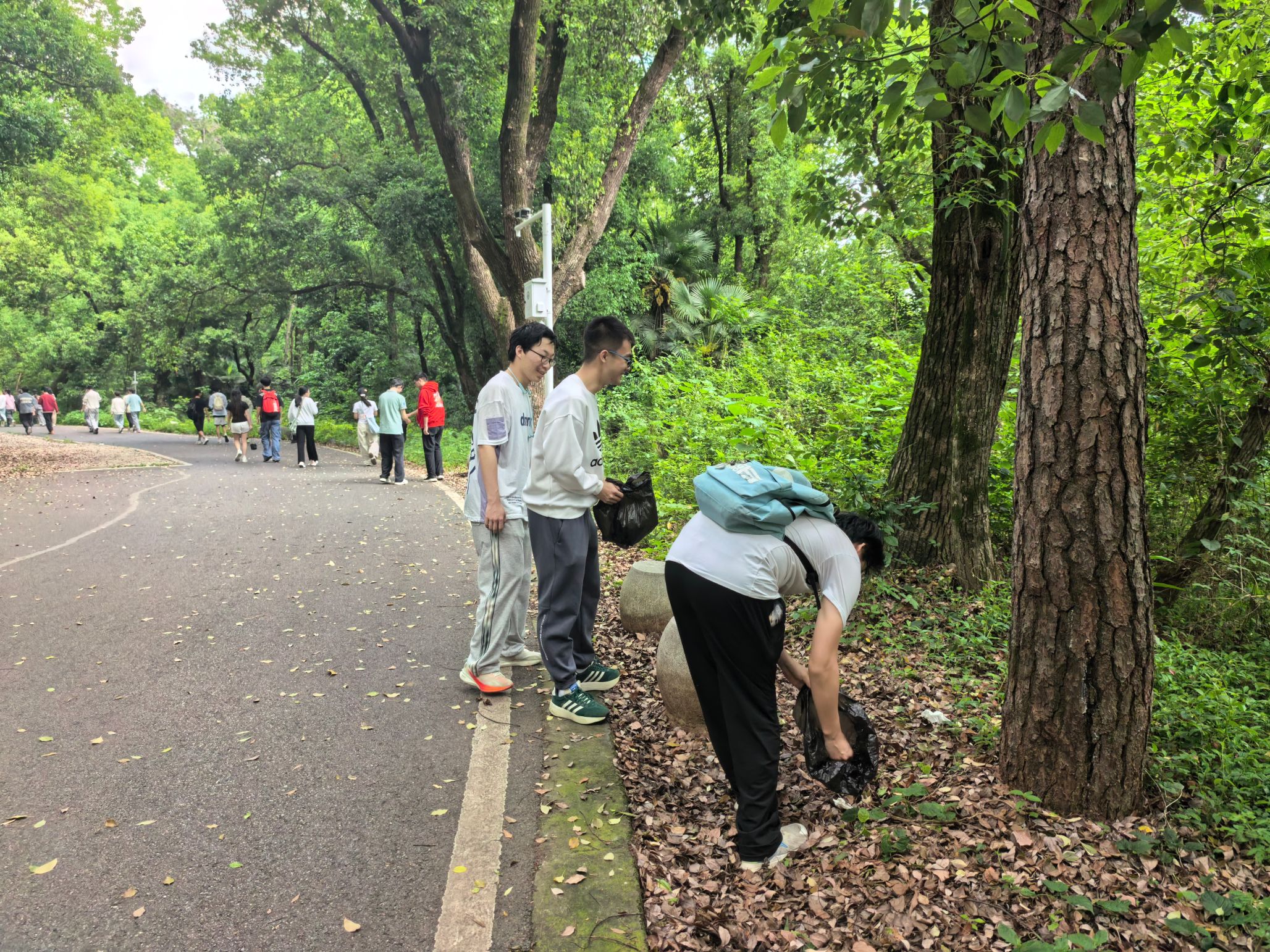 当天下午,同学们准时在珞珈山庄门口集合完毕,一张张青春洋溢的面孔在春日的暖阳下定格为一张集体合影。队伍沿环山南路前行,途经承载历史记忆的“十八栋”,再转入环山北路绕山而行。与单纯的登山踏青不同,同学们手中多了一份工具与责任——沿途俯身捡拾散落的垃圾,以实际行动践行劳动教育。途中,老师们也参与到清洁行动中,一边与同学们畅谈珞珈山的历史,一边聊近日学习生活。山林间跃动的身影与洁净如初的山道,构成了珞珈山最动人的春日图景。环山徒步与清洁后,队伍返回珞珈山庄门口,活动在汗水与欢笑中圆满收官。