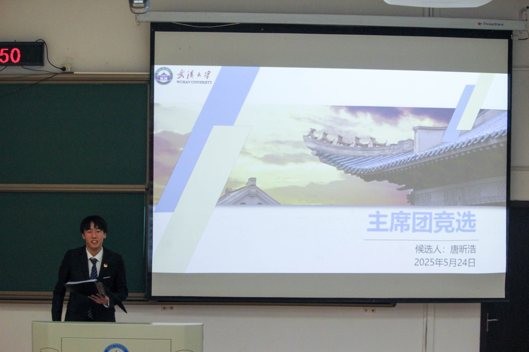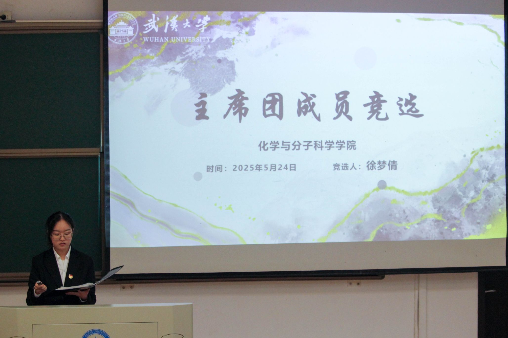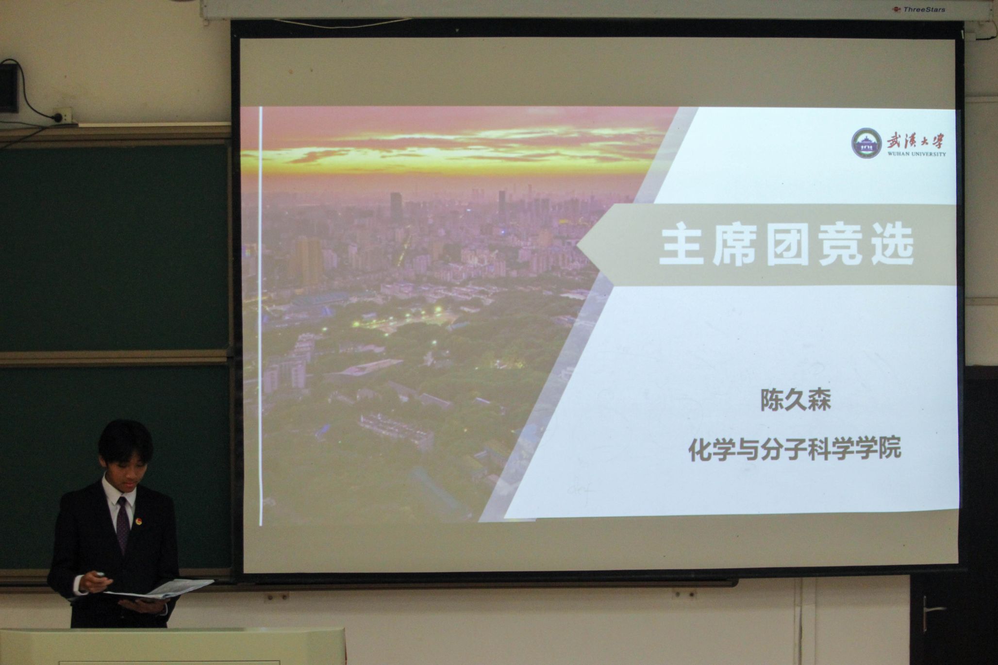 随后,唐昕浩、徐梦倩、陈久森、张霞四位主席团候选人依次上台发表竞选演讲并抽取题目进行答辩。